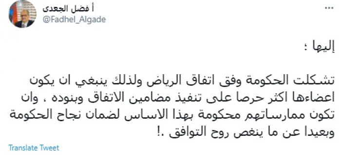 وكتب في تغريدة عبر "تويتر" رصدها "المشهد العربي": "تشكلت الحكومة وفق اتفاق الرياض ولذلك ينبغي أن يكون أعضاءها أكثر حرصًا على تنفيذ مضامين الاتفاق وبنوده ، وأن تكون ممارساتهم محكومة بهذا الأساس لضمان نجاح الحكومة وبعيدًا عن ما ينغص روح التوافق".
