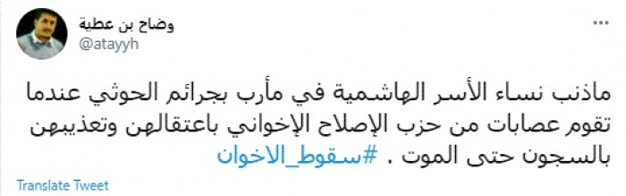 وقال في تغريدة عبر "تويتر" رصدها "المشهد العربي": "ما ذنب نساء الأسر الهاشمية في مأرب بجرائم الحوثي عندما تقوم عصابات من حزب الإصلاح الإخواني باعتقالهن وتعذيبهن بالسجون حتى الموت".