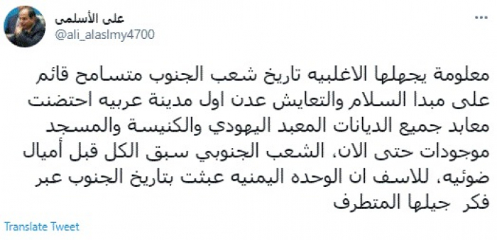 وقال في تغريدة على حسابه بموقع التدوين المصغر تويتر، اليوم: "معلومة يجهلها الأغلبية، تاريخ شعب الجنوب متسامح قائم على مبدأ السلام والتعايش".