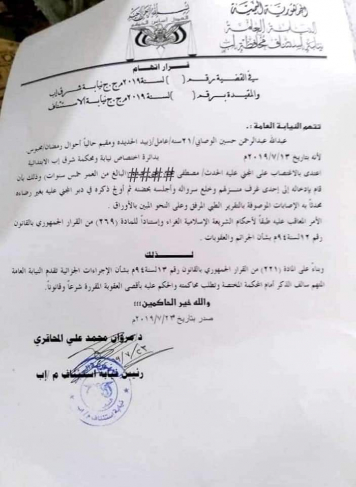 وقالت مصادر لـ"المشهد العربي"، إن القاضي حسن الخطاب بمحكمة غرب إب، أصدر حكمًا ببراءة المدعو عبدالله الوصابي المُتهم باغتصاب الطفل "مصطفى ح. ي"، إلى جانب تغريم والدي المجني عليه 200 ألف ريال.