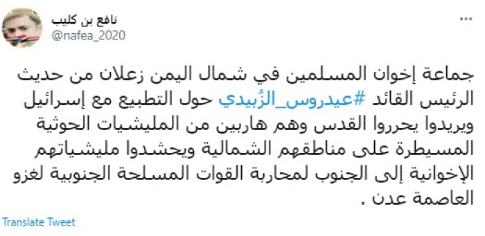 وقال في تغريدة عبر "تويتر" رصدها "المشهد العربي": "جماعة إخوان المسلمين في شمال اليمن زعلانين من حديث الرئيس القائد عيدروس الزُبيدي حول التطبيع مع إسرائيل ويريدوا يحرروا القدس وهم هاربين من المليشيات الحوثية المسيطرة على مناطقهم الشمالية ويحشدوا مليشياتهم الإخوانية إلى الجنوب لمحاربة القوات المسلحة الجنوبية لغزو العاصمة عدن".