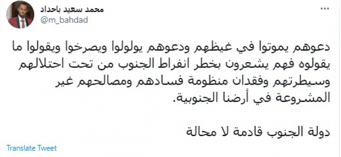 قال الناشط السياسي محمد سعيد باحداد، اليوم، إن دولة الجنوب قادمة لا محالة.
