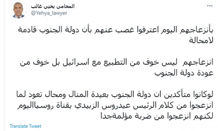 وقال في تغريدة عبر "تويتر" رصدها "المشهد العربي": "بأنزعاجهم اليوم اعترفوا غصب عنهم بأن دولة الجنوب قادمة لا محالة".
