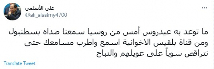 وكتب في تغريدة عبر "تويتر" رصدها "المشهد العربي": "ما توعد به عيدروس أمس من روسيا سمعنا صداه بإسطنبول ومن قناة بلقيس الإخوانية اسمع واطرب مسامعك حتى نتراقص سويًا على عويلهم والنباح".