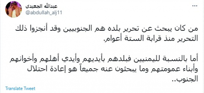 وكتب في تغريدة عبر "تويتر" رصدها "المشهد العربي": "من كان يبحث عن تحرير بلده هم الجنوبيين وقد أنجزوا ذلك التحرير منذ قرابة الستة أعوام".