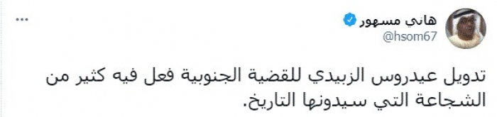 وقال في تغريدة عبر "تويتر" رصدها "المشهد العربي": "تدويل عيدروس الزُبيدي للقضية الجنوبية فعل فيه كثير من الشجاعة التي سيدونها التاريخ".