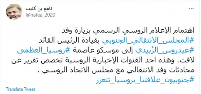 وقال في تغريدة عبر "تويتر" رصدها "المشهد العربي": "اهتمام الإعلام الروسي الرسمي بزيارة وفد المجلس الانتقالي الجنوبي بقيادة الرئيس القائد عيدروس الزُبيدي إلى موسكو عاصمة روسيا العظمى لافت".