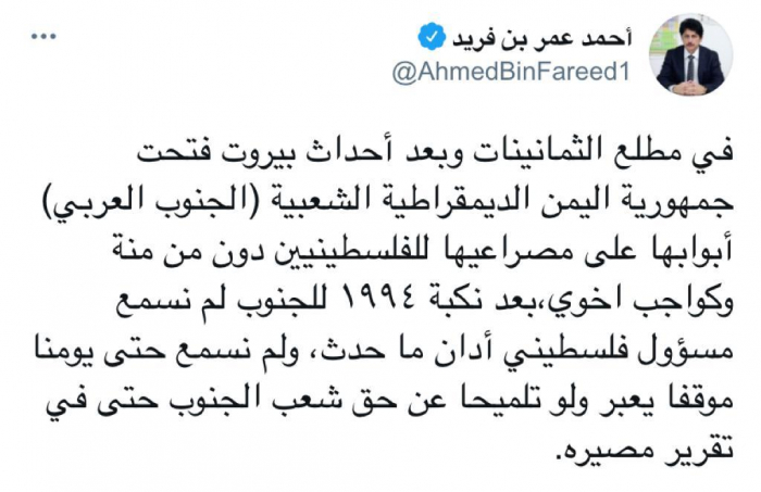 وكتب "بن فريد" تغريدة عبر تويتر، رصدها "المشهد العربي": "في مطلع الثمانينات وبعد أحداث بيروت فتحت جمهورية اليمن الديمقراطية الشعبية (الجنوب العربي)، أبوابها على مصراعيها للفلسطينيين دون من منة وكواجب أخوي، بعد نكبة 1994 للجنوب لم نسمع مسؤول فلسطيني أدان ما حدث، ولم نسمع حتى يومنا موقفًا يعبر ولو تلميحًا عن حق شعب الجنوب حتى في تقرير مصيره".