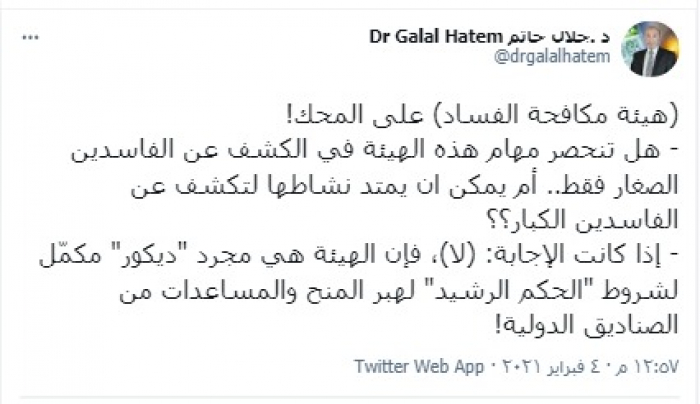 وكتب "حاتم" تغريدة عبر تويتر، رصدها "المشهد العربي": "(هيئة مكافحة الفساد) على المحك - هل تنحصر مهام هذه الهيئة في الكشف عن الفاسدين الصغار فقط.. أم يمكن ان يمتد نشاطها لتكشف عن الفاسدين الكبار؟".