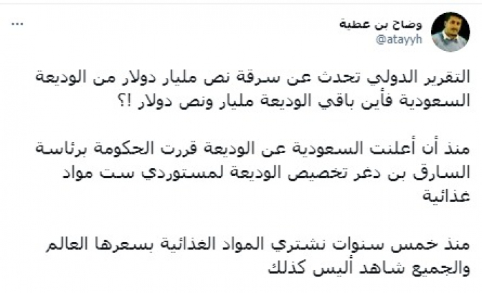 ورأى في تغريدة على حسابه بموقع التدوين المصغر تويتر، اليوم أن: "التقرير الدولي تحدث عن سرقة نصف مليار دولار من الوديعة السعودية فأين باقي الوديعة مليار ونص دولار؟".