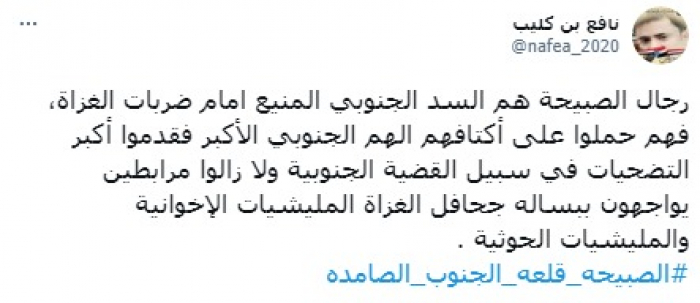 وأنهى تغريدته بهاشتاج: "الصبيحة قلعة الجنوب الصامدة".