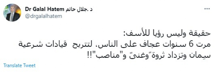 وكتب في تغريدة عبر "تويتر" رصدها "المشهد العربي": "حقيقة وليس رؤية للأسف: مرت 6 سنوات عجاف على الناس، لتتربح قيادات شرعية سِمان وتزداد ثروة ًوغنىً ومناصب".