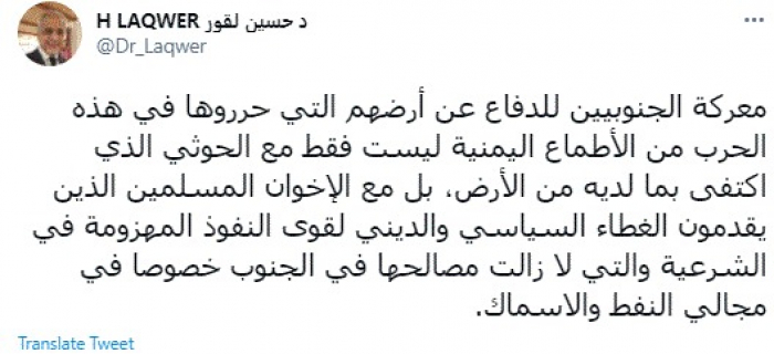 وأضاف: "بل مع الإخوان المسلمين الذين يقدمون الغطاء السياسي والديني لقوى النفوذ المهزومة في الشرعية والتي لا زالت مصالحها في الجنوب خصوصًا في مجالي النفط والأسماك".