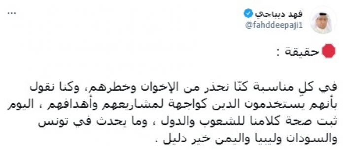 وأوضح في تغريدة على حسابه بموقع التدوين المصغر تويتر، اليوم أنه: "في كلِ مناسبة كنّا نحذر من الإخوان وخطرهم، وكنا نقول بأنهم يستخدمون الدين كواجهة لمشاريعهم وأهدافهم".
