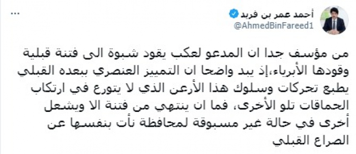 وقال في تغريدة على حسابه بموقع التدوين المصغر تويتر، اليوم: "من المؤسف جدا أن المدعو لعكب يقود شبوة إلى فتنة قبلية وقودها الأبرياء".