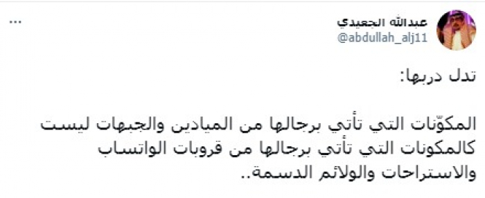 وقال في تغريدة على حسابه بموقع التدوين المصغر تويتر، اليوم: "تدل دربها: المكوّنات التي تأتي برجالها من الميادين والجبهات ليست كالمكونات التي تأتي برجالها من قروبات الواتساب والاستراحات والولائم الدسمة".