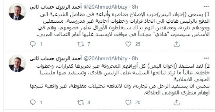 وكتب في تغريدات عبر "تويتر" رصدها "المشهد العربي": "يسعى (إخوان اليمن) حزب الإصلاح بعناصره وأتباعه في مفاصل الشرعية إلى الدفع بالرئيس هادي إلى اتخاذ قرارات وخطوات أحادية غير مدروسة، مستغلين وجودهم بقربه".