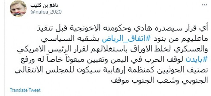 وكتب في تغريدة عبر "تويتر" رصدها "المشهد العربي": "أي قرار سيصدره هادي وحكومته الإخونجية قبل تنفيذ ماعليهم من بنود اتفاق الرياض بشقيه السياسي والعسكري لخلط الأوراق باستغلالهم لقرار الرئيس الأمريكي بايدن لوقف الحرب في اليمن وتعيين مبعوثًا خاصًا له ورفع تصنيف الحوثيين كمنظمة إرهابية سيكون للمجلس الانتقالي الجنوبي وشعب الجنوب موقف".