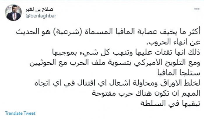 وكتب في تغريدة عبر "تويتر" رصدها "المشهد العربي": "أكثر ما يخيف عصابة المافيا المسماة (شرعية) هو الحديث عن إنهاء الحروب".