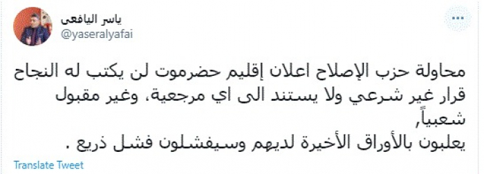 وكتب في تغريدة عبر "تويتر" رصدها "المشهد العربي": "محاولة حزب الإصلاح إعلان إقليم حضرموت لن يكتب له النجاح قرار غير شرعي ولا يستند إلى أي مرجعية، وغير مقبول شعبيًا".