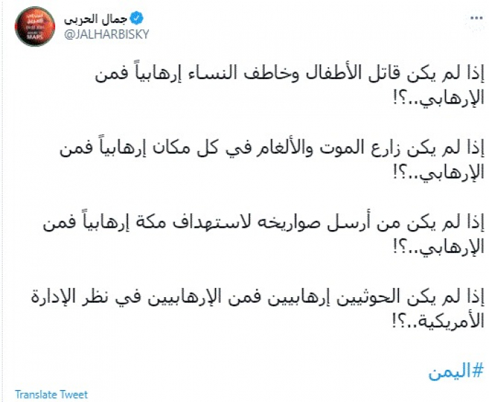 وقال في تغريدة عبر "تويتر" رصدها "المشهد العربي": "إذا لم يكن قاتل الأطفال وخاطف النساء إرهابيًا فمن الإرهابي..؟! إذا لم يكن زارع الموت والألغام في كل مكان إرهابيًا فمن الإرهابي؟".