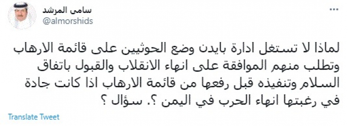 وقال في تغريدة عبر "تويتر" رصدها "المشهد العربي": "لماذا لا تستغل إدارة بايدن وضع الحوثيين على قائمة الإرهاب وتطلب منهم الموافقة على إنهاء الانقلاب والقبول باتفاق السلام وتنفيذه قبل رفعها من قائمة الإرهاب إذا كانت جادة في رغبتها إنهاء الحرب في اليمن؟. سؤال؟".