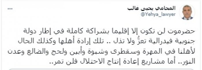 وكتب "غالب" تغريدة عبر تويتر، رصدها "المشهد العربي": "حضرموت لن تكون إلا إقليما بشراكة كاملة في إطار دولة جنوبية فيدرالية تعزُّ ولا تذل .. تلك إرادة أهلها وكذلك الحال لأهلنا في المهرة وسقطرى وشبوة وأبين ولحج والضالع وعدن النور.. أما مشاريع إعادة إنتاج الاحتلال فلن تمر".