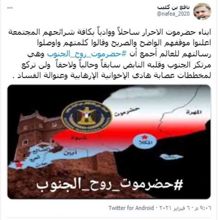 وكتب "بن كليب" تغريدة عبر تويتر، رصدها "المشهد العربي": "أبناء حضرموت الأحرار ساحلا وواديا بكافة شرائحهم المجتمعة أعلنوا موقفهم الواضح والصريح وقالوا كلمتهم وأوصلوا رسالتهم للعالم أجمع أن حضرموت روح الجنوب، وهي مرتكز الجنوب وقلبه النابض سابقا وحاليا ولاحقا، ولن تركع لمخططات عصابة هادي الإخوانية الإرهابية وعتاولة الفساد" .