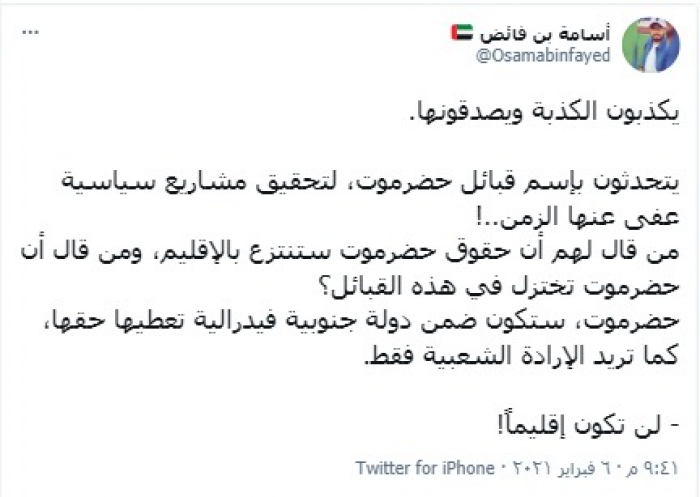 وكتب "بن فائض" عبر تغريدة له رصدها "المشهد العربي": "يكذبون الكذبة ويصدقونها، يتحدثون بإسم قبائل حضرموت، لتحقيق مشاريع سياسية عفى عنها الزمن".