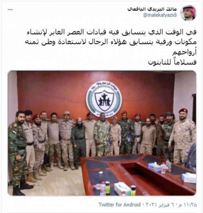 وكتب "اليافعي" تغريدة عبر حسابه بتويتر، رصدها "المشهد العربي": "في الوقت الذي يتسابق فيه قيادات العصر الغابر لإنشاء مكونات ورقية، يتسابق هؤلاء الرجال لاستعادة وطن ثمنه أرواحهم، فسلامًا للثابتين".