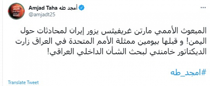 وقال في تغريدة عبر "تويتر" رصدها "المشهد العربي": "المبعوث الأممي مارتن غريفيث يزور إيران لمحادثات حول اليمن! وقبلها بيومين ممثلة الأمم المتحدة في العراق زارت الديكتاتور خامنئي لبحث الشأن الداخلي العراقي".