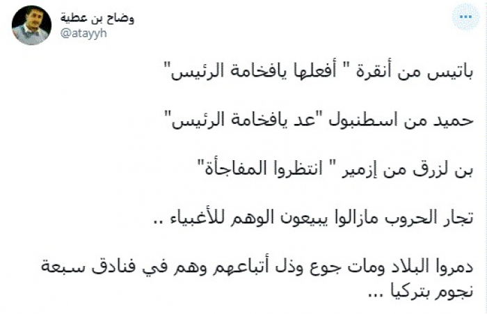 وقال في تغريدة عبر "تويتر" رصدها "المشهد العربي": "باتيس من أنقرة أفعلها يافخامة الرئيس.. حميد من إسطنبول عد يافخامة الرئيس.. بن لزرق من إزمير انتظروا المفاجأة.. تجار الحروب مازالوا يبيعون الوهم للأغبياء".