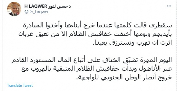 وقال في تغريدة عبر "تويتر" رصدها "المشهد العربي": "سقطرى قالت كلمتها عندما خرج أبناءها وأخذوا المبادرة بأيديهم ويومها أختفت خفافيش الظلام إلا من نعيق غربان آثرت أن تهرب وتسترزق بعيدًا".