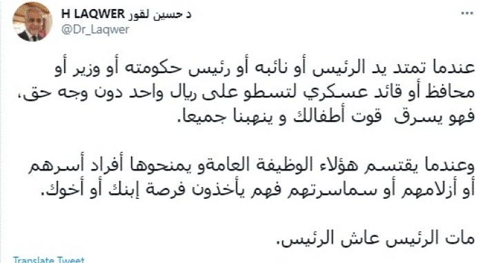 وقال في تغريدة عبر "تويتر" رصدها "المشهد العربي": "عندما تمتد يد الرئيس أو نائبه أو رئيس حكومته أو وزير أو محافظ أو قائد عسكري لتسطو على ريال واحد دون وجه حق، فهو يسرق قوت أطفالك وينهبنا جميعًا".
