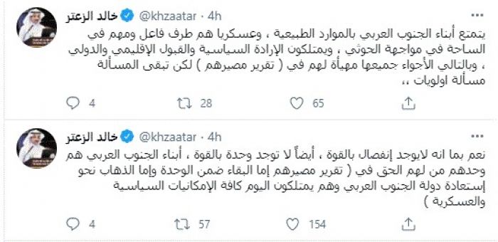 وكتب في سلسلة تغريدات عبر "تويتر" رصدها "المشهد العربي": "نعم بما أنه لايوجد انفصال بالقوة، أيضًا لا توجد وحدة بالقوة، أبناء الجنوب العربي هم وحدهم من لهم الحق في (تقرير مصيرهم إما البقاء ضمن الوحدة وإما الذهاب نحو استعادة دولة الجنوب العربي وهم يمتلكون اليوم كافة الإمكانيات السياسية والعسكرية)".