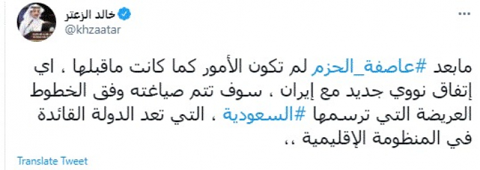 وكتب في تغريدة عبر "تويتر" رصدها "المشهد العربي": "ما بعد عاصفة الحزم لم تكون الأمور كما كانت ما قبلها، أي اتفاق نووي جديد مع إيران، سوف تتم صياغته وفق الخطوط العريضة التي ترسمها السعودية، التي تعد الدولة القائدة في المنظومة الإقليمية".