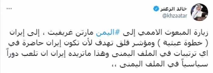 وأشار في تغريدة على حسابه بموقع التدوين المصغر تويتر، اليوم إلى أن: "زيارة المبعوث الأممي إلى اليمن مارتن غريفيث، إلى إيران (خطوة عبثية)، ومؤشر قلق".