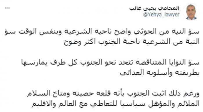 وأوضح في تغريدة على حسابه بموقع التدوين المصغر تويتر، اليوم أن: "سوء النية من الحوثي واضح ناحية الشرعية وبنفس الوقت سوء النية من الشرعية ناحية الجنوب، أكثر وضوحا".