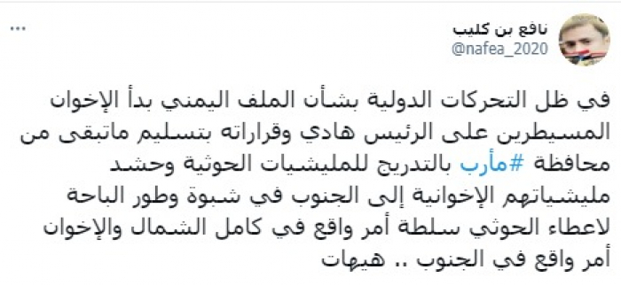 وشدد في تغريدة على حسابه بموقع التدوين المصغر تويتر، اليوم على أنه: "في ظل التحركات الدولية بشأن الملف اليمني بدأ الإخوان المسيطرون على الرئيس هادي وقراراته بتسليم ما تبقى من محافظة مأرب بالتدريج للمليشيات الحوثية".