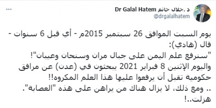 وقال في تغريدة على حسابه بموقع التدوين المصغر تويتر، اليوم إنه: "يوم السبت الموافق 26 سبتمبر 2015م - أي قبل 6 سنوات - قال (هادي): "سنرفع علم اليمن على جبال مران وسنحان وعيبان"!.