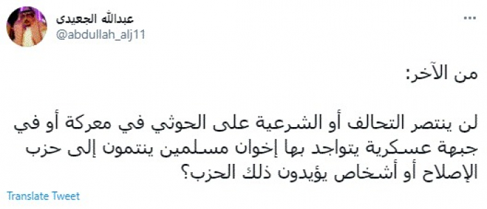وكتب في تغريدة عبر "تويتر" رصدها "المشهد العربي": "من الآخر: لن ينتصر التحالف أو الشرعية على الحوثي في معركة أو في جبهة عسكرية يتواجد بها إخوان مسلمين ينتمون إلى حزب الإصلاح أو أشخاص يؤيدون ذلك الحزب؟".