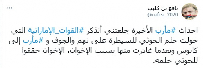 وقال في تغريدة عبر "تويتر" رصدها "المشهد العربي": "أحداث مأرب الأخيرة جعلتني أتذكر القوات الإماراتية التي حولت حلم الحوثي للسيطرة على نهم والجوف ومأرب إلى كابوس وبعدما غادرت منها بسبب الإخوان، الإخوان حققوا للحوثي حلمه".