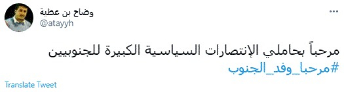 وقال في تغريدة عبر "تويتر" رصدها "المشهد العربي": "مرحبًا بحاملي الانتصارات السياسية الكبيرة للجنوبيين ".
