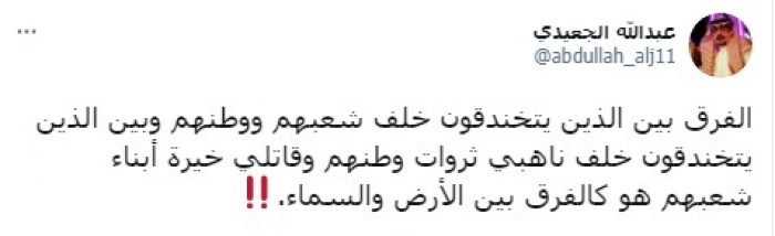 وأوضح في تغريدة على حسابه بموقع التدوين المصغر تويتر، اليوم أن: "الفرق بين الذين يتخندقون خلف شعبهم ووطنهم وبين الذين يتخندقون خلف ناهبي ثروات وطنهم وقاتلي خيرة أبناء شعبهم هو كالفرق بين الأرض والسماء".
