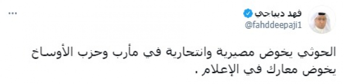 وقال في تغريدة على حسابه بموقع التدوين المصغر تويتر، اليوم إن: "الحوثي يخوض معركة مصيرية وانتحارية في مأرب وحزب ...... يخوض معارك في الإعلام".