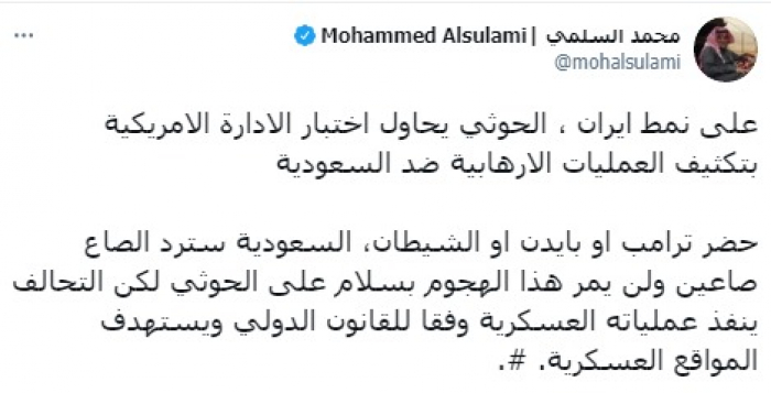 ونبه في تغريدة على حسابه بموقع التدوين المصغر تويتر، اليوم إلى أنه: "على نمط إيران، الحوثي يحاول اختبار الإدارة الأمريكية بتكثيف العمليات الإرهابية ضد السعودية".
