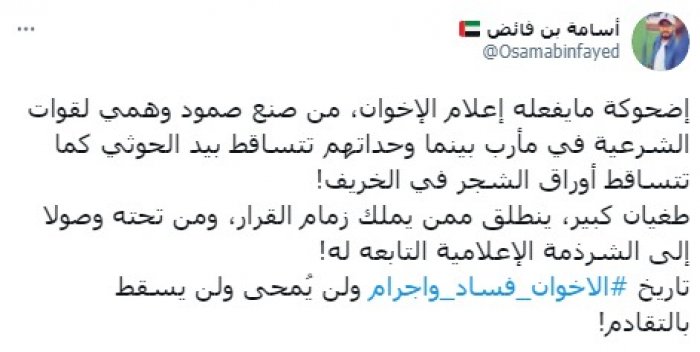وقال في تغريدة على حسابه بموقع التدوين المصغر تويتر، اليوم: "أضحوكة ما يفعله إعلام الإخوان، من صنع صمود وهمي لقوات الشرعية في مأرب بينما وحداتهم تتساقط بيد الحوثي كما تتساقط أوراق الشجر في الخريف!".