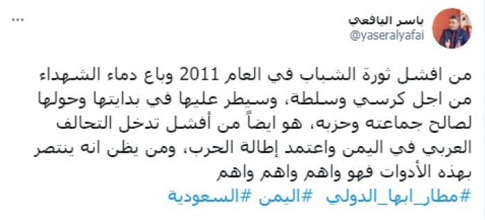 ورأى في تغريدة على حسابه بموقع التدوين المصغر تويتر، اليوم أن: "من أفشل ثورة الشباب في العام 2011 وباع دماء الشهداء من أجل كرسي وسلطة، وسيطرعليها في بدايتها وحولها لصالح جماعته وحزبه، هو أيضا من أفشل تدخل التحالف العربي في اليمن".