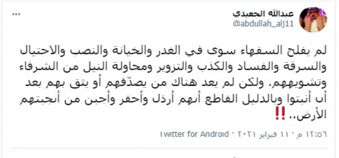 وكتب "الجعيدي" تغريدة عبر تويتر، رصدها "المشهد العربي": "لم يفلح السفهاء سوى في الغدر والخيانة والنصب والاحتيال والسرقة والفساد والكذب والتزوير ومحاولة النيل من الشرفاء وتشويههم".