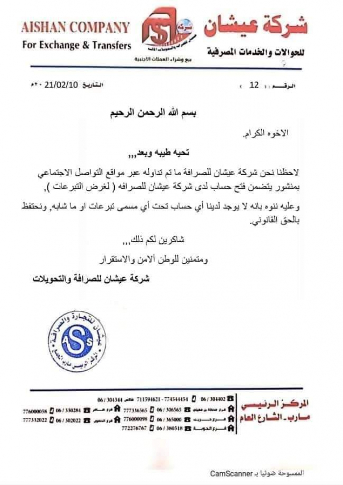 واعلن القائمون على تلك الحملة التي دشنت على مواقع التواصل الاجتماعي قيامهم بفتح حسابات لدى شركة عيشان للصرافة؛ غير ان شركة الصرافة الشهيرة في مأرب سارعت إلى إصدار بيان تنفي فتح أي حساب للتبرعات لديها، وهددت بمقاضاة القائمين على تلك الحملات.